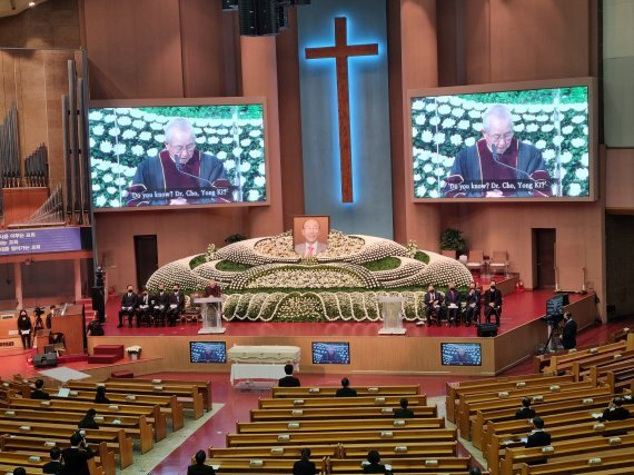 | 故조용기 목사 장례예배.."사랑해요 목사님" 성도들 오열김해솔 입력 2021. 09. 18. 11:16 ![]() 18일 여의도순복음교회 대성전에서 열린 고(故) 조용기 목사 장례예배에서 극동방송 이사장인 김장환 목사가 설교를 하고 있다. /사진=김해솔 수습기자 [파이낸셜뉴스] 여의도순복음교회 설립자인 고(故) 조용기 목사의 장례예배(천국환송예배)가 18일 열렸다. 이날 열린 장례예배는 생전 고인의 삶을 되새기고 교회의 앞날을 다짐하는 자리였다. 코로나19로 예배에 함께하지 못한 신도들은 교회 밖에서 눈물로 고인을 배웅했다. 지난 14일 별세한 조 목사의 장례예배는 18일 오전 8시 여의도순복음교회 대성전에서 유가족, 교회관계자 등 일부만 참여한 가운데 열렸다. 코로나19 방역 문제로 교회 안에는 소수 인원만이 드문드문 앉아 있었다. 이날 예배는 유튜브를 통해 생중계 됐다. 예배에 참석하지 못한 일반 신도들은 대성전 앞마당에서 운구 행렬을 기다렸다. 새벽부터 찬송가를 부르던 신도들은 오전 7시20분쯤 운구차가 도착하자 흐느끼기 시작했다. “사랑해요 목사님” “감사합니다”라고 외치는 이도 있었다. 이날 예배는 신앙고백과 찬송으로 시작해 한국교회총연합 대표회장 장종현 목사의 대표기도로 이어졌다. 장 목사는 "조 목사가 주님이 맡긴 사명을 감당하다가 부름을 받았다"며 “(하나님이) 슬픔에 잠겨 있는 유족과 교회 성도들을 위로해 주기를 바란다”고 말했다. 설교는 극동방송 이사장 김장환 목사가 고인과 인연을 추억하며 기도의 중요성에 대해 말했다. 김 목사는 “나는 기도를 하루에 1시간 할까 말까 했는데 조 목사는 매일 5시간씩 기도한다고 말했다"며 “예수님 생애의 우선순위는 기도였고 고인도 마찬가지였던 것"이라고 강조했다. 이어 조 목사의 60여년에 걸친 사역을 소개하는 영상과 국내외 목회자들의 추모 영상 메시지, 추모시 ‘꽃잎은 져도 그 향기는 지지 않습니다’ 낭독이 이어졌다. 조사는 이철 한교총 대표회장이 읊었다. 이 회장은 “조용기 목사는 믿음의 사람, 성령의 사람, 하나님의 사람이었다”며 “여의도순복음교회가 기독교인들의 모범이 돼야 한다”고 당부했다. 그는 “여의도순복음교회는 세계의 교회”라며 “앞으로 미래의 교회, 사랑의 공동체가 돼야 한다”고 말했다. 이어 여의도순복음교회 위임목사인 이영훈 목사가 조 목사와 교회의 약력을 소개하고 고인의 차남 조민제 국민일보 회장이 가족대표로 감사 인사를 전했다. 경동교회 원로목사인 박종화 목사의 축도를 끝으로 이날 예배는 오전 9시쯤 1시간 만에 마무리됐다. ![]() 예배 후 운구 행렬이 교회 밖으로 나가자 교회 밖에서 기다리고 있던 신도들은 다시 흐느끼기 시작했다. 운구차가 떠나가자 흐느낌은 오열로 바뀌었다. 조 목사의 장지는 경기도 파주시 오산리최자실국제금식기도원에 마련됐다. 18일 여의도순복음교회 대성전에서 열린 고 조용기 목사 장례예배 이후 운구 행렬이 교회를 떠날 준비를 하고 있다. /사진=김해솔 |