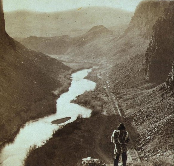 네바다에 새로 건설된 대륙 횡단 열차를 보고 있는 미국 원주민. 1868년 추정.