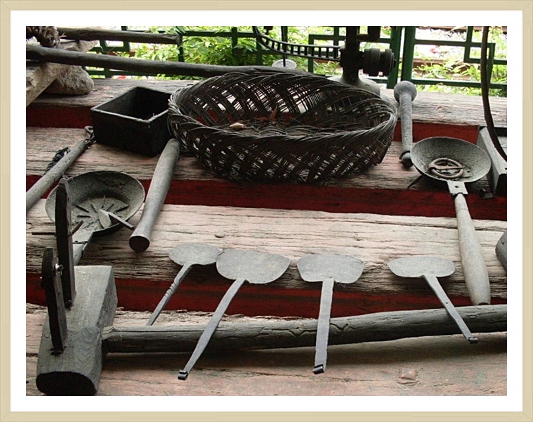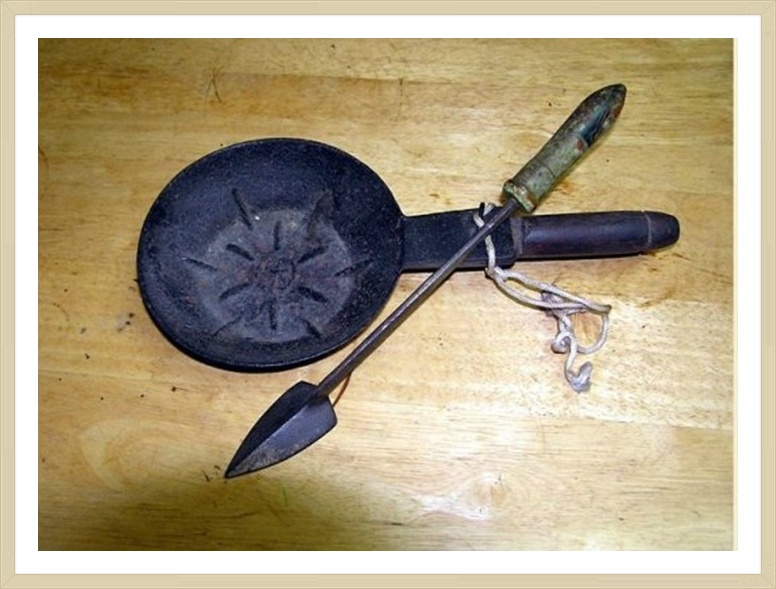 둥근것은 다리미(숫불을 담아서) 작고 뾰죽한것은 인두 여인들옷의 좁은부분을 다리는도구