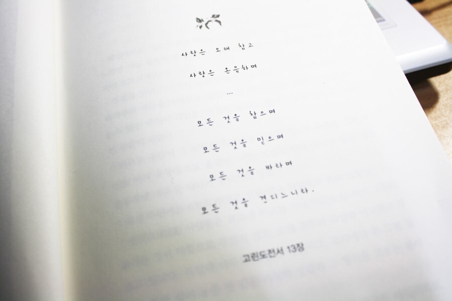 사랑은 오래 참고 사랑은 온유하며 모든것을 참으며 모든것을 믿으며 모든것을 바라며 모든것을 견디느니라