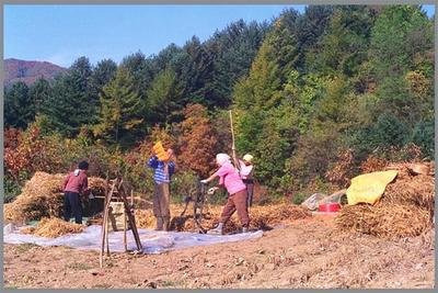 도리깨로 콩을 터는군요.